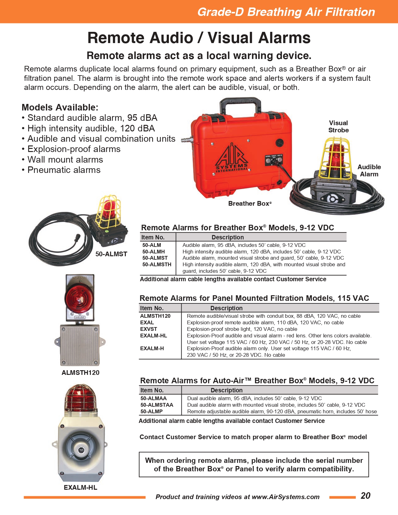 - Alarms: Dual audible (95-120 dBA) and visual remote strobes